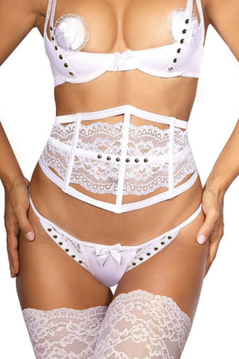 The white half-corset charms with its fancy design of lace and top-quality ribbons. The custom cut and gold-colored studs only add freshness and coquettish charm to this proposal. The model is equipped with underwire and double-breasted hook and eye for your wearing comfort. Bra, panty and stockings sold separately.