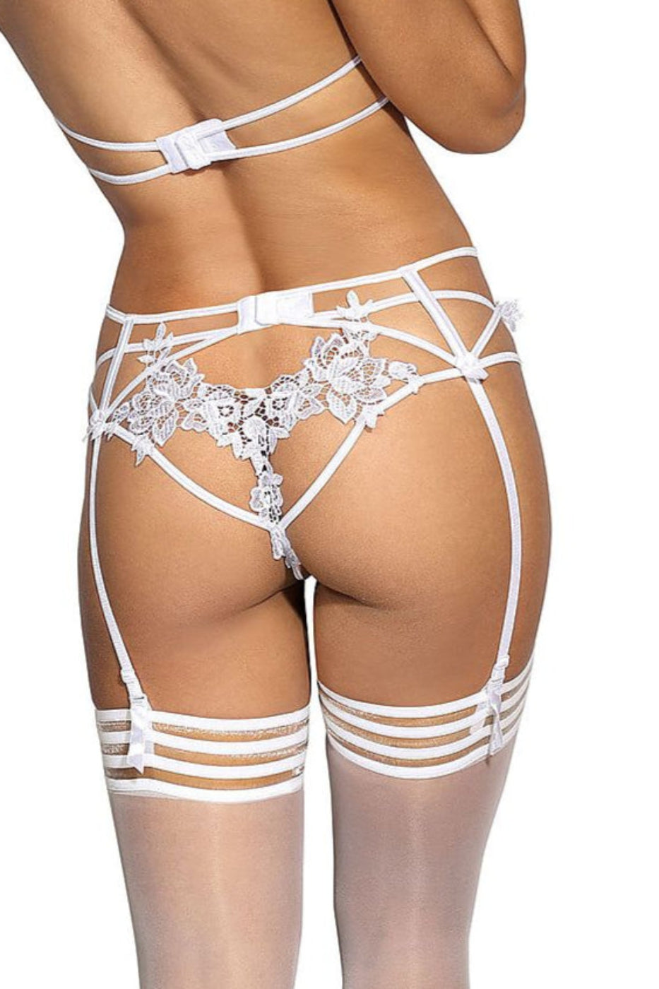 Transparent garter belt with embroidered white motif is a one of a kind proposition. It wraps around the waist and emphasizes the roundness of hips. In set with bra and thong it looks amazing. The belt is fastened at the back with hooks. Bra, panty and stockings sold separately.