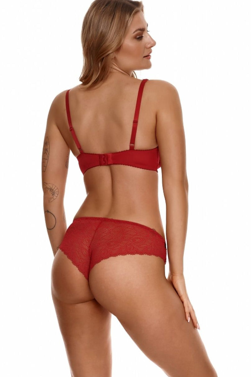 Sensual, and at the same time romantic, soft bra, delights with its delicacy and airiness. The model is kept in the color of sexy red with elements of timeless black. The design, which perfectly collects and models medium and larger breasts. Between the cups a charming bow contrasting with the whole. Adjustable, non-removable straps.