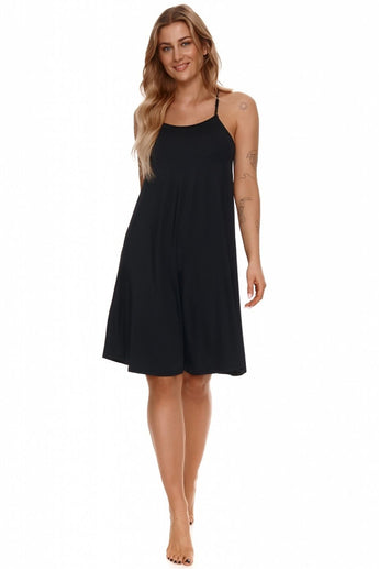 Black, classic yet elegant chemise ideal for women who appreciate chic and comfort in one. Smooth, flared front, knee-length. Adjustable strap, combined with guipure on the back, which gives the whole a unique character.