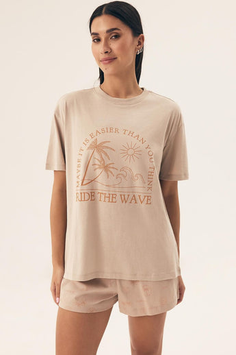 Stylish women's pajamas, consisting of a short-sleeved shirt with a round neckline, decorated with a trendy print, and short shorts, which also have a print. The loose, comfortable cut ensures comfort throughout the night. The shorts are pocketless, and the wide elastic waistband guarantees a perfect fit. The pajamas are packed in a practical plastic bag, perfect for a gift or for everyday relaxation at home.