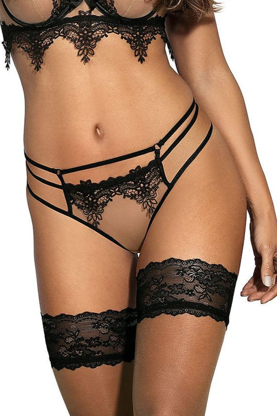Sophisticated thong is an underwear whose aim is to surprise and tempt. Thong was sewn from transparent beige tulle and black subtle lace, topped with straps. An original combination attracts attention and ignites the senses, especially when combined with a bra. Bra and stockings sold separately