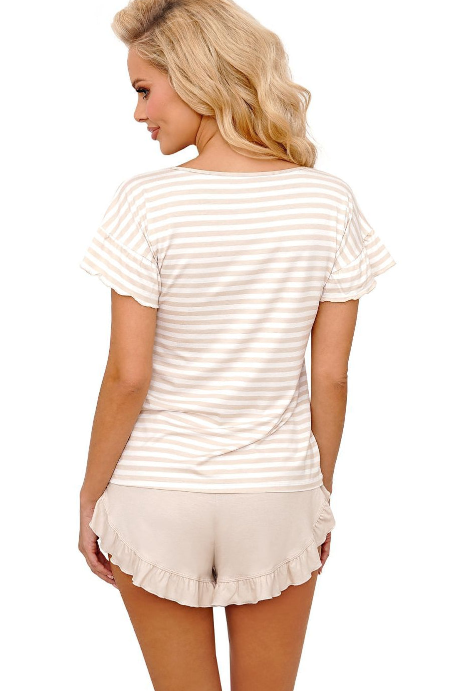 Marina 1-2 pajamas are a timeless proposition with subdued yet leading colors. The chemise has a v-neck, with sleeves finished with a frill. White and beige stripes allude to the navy pattern. The shorts are uniformly beige. Legs of a cut gently rising to the sides, finished with a draped strip of fabric. Made in Poland.