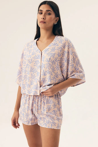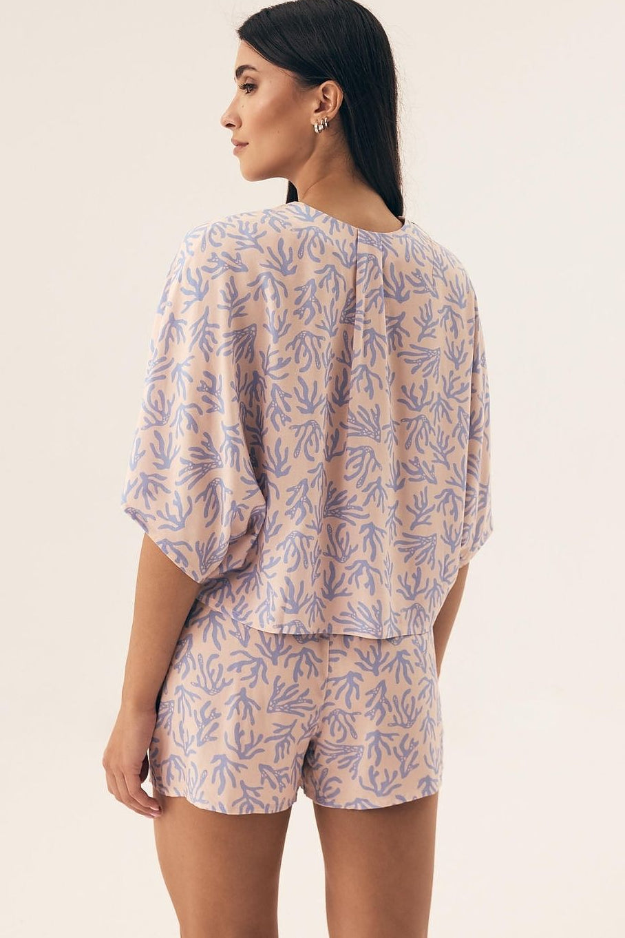 This women's pajama is a perfect combination of elegance and comfort, ideal for every night. Made of delicate viscose, it is incredibly soft and breathable, ensuring maximum comfort during sleep. The short shirt with short sleeves has a V-neckline and a classic button fastening, giving it a stylish and timeless look. The loose, comfortable cut and material with a subtle print make it look light and feminine. The shorts, matching the set, have an elastic band at the waist and drawstrings at the waist, allowing for a perfect fit to the silhouette. The lack of pockets makes them exceptionally lightweight and comfortable. The whole set is packed in a practical bag, making it a great gift idea. A stylish choice for women who appreciate comfort and elegance!